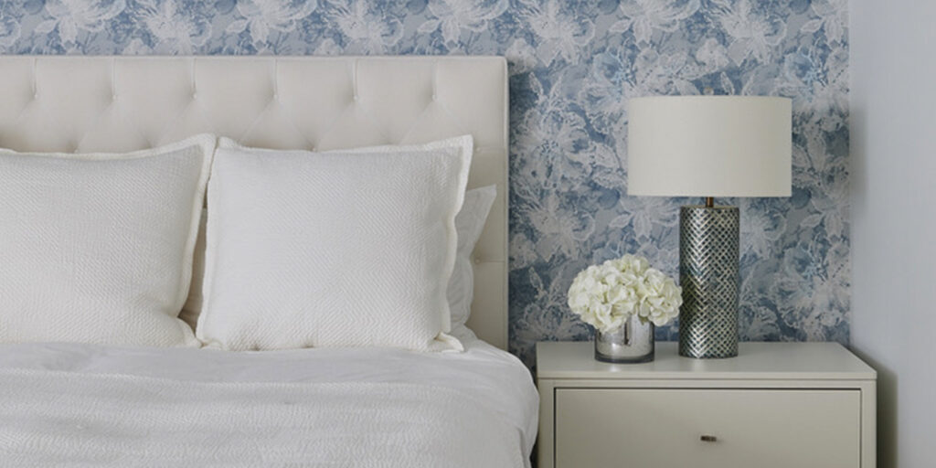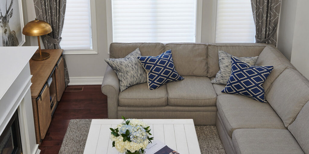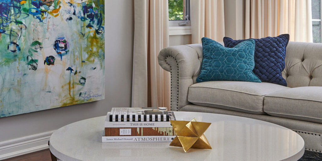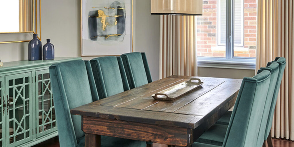 We added more patterns with chevron and paisley toss pillows, a Marrakesh area rug, all layered with textures of linen, leather and velvet. A beautiful and super-functional sideboard with iron banding detail separates the seating and crafting areas. A custom built-in banquette is a perfect spot for crafts or casual meals. Integrated drawer storage is great to stow away and hide supplies. We had the pedestal table made in a forgiving distressed finish maple with a fun pale blue stain. We layered more fabric patterns with the seat cushion in a blue and white pinstripe and back pillows in houndstooth and a colourful watercolour floral.