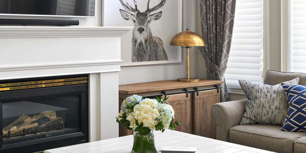 They wanted a family room that was kid-friendly, organized, warm and comfortable. We wanted to blend styles with classic lines, natural materials and a coastal/industrial/farmhouse vibe. We started by replacing the wall to the kitchen with a custom glass railing and stairs for great site-lines between the two spaces. The new gas fireplace extends to the vaulted ceiling with a simple shiplap cladding, and a small scale herringbone Oriental Alps marble surround. We designed the built-in for the tv with plenty of closed storage and open shelves and we love the wood top with the white millwork.