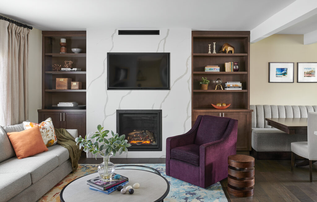 This living room underwent a thoughtful transformation to enhance both functionality and style. We began by installing new wide-plank hardwood flooring throughout, bringing warmth and continuity to the space. The fireplace wall was completely redesigned, featuring a custom surround with striking marble-look panels and bespoke built-ins on either side. These built-ins not only provide tailored storage and display opportunities but also elevate the architectural character of the room.