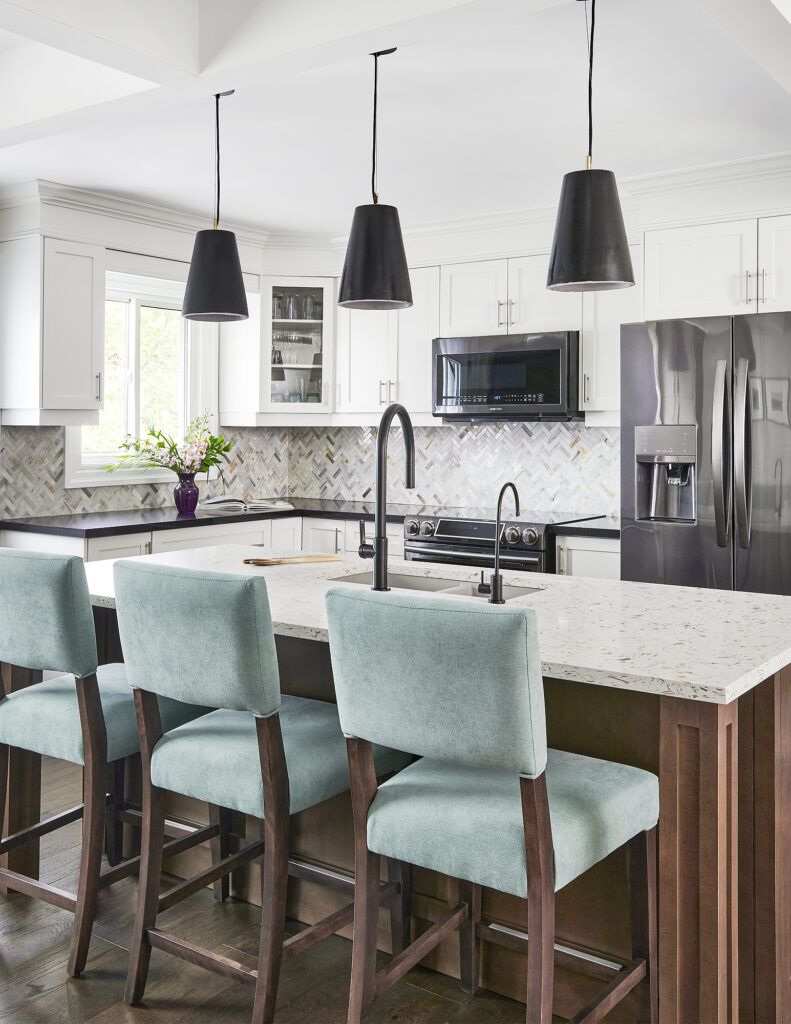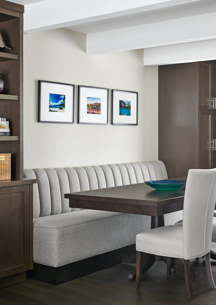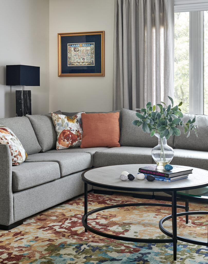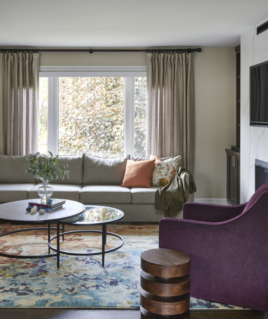 To improve flow and foster connection between spaces, we opened up the wall leading into the adjacent kitchen and dining area. This created a more open-concept layout, perfect for both everyday living and entertaining. Full-length custom drapery was added to soften the natural light and introduce a sense of elegance, while also enhancing acoustics and privacy. Together, these updates transformed the room into a polished, comfortable space that seamlessly blends classic detailing with modern design sensibilities.
