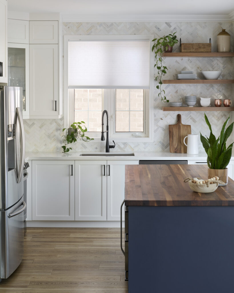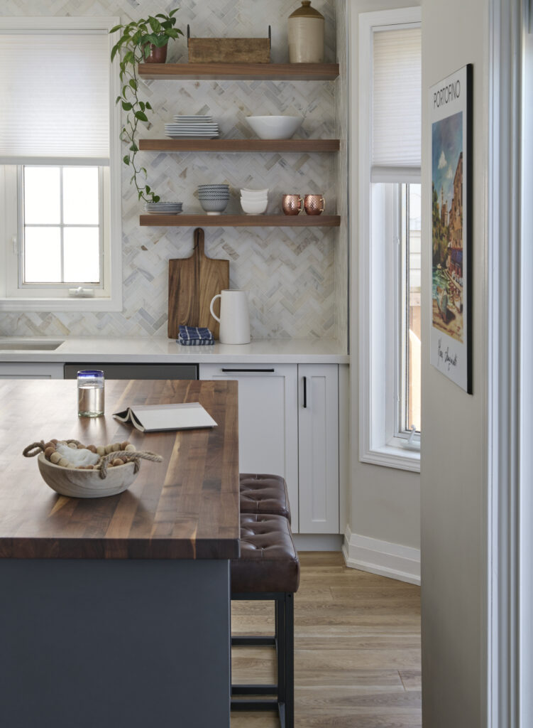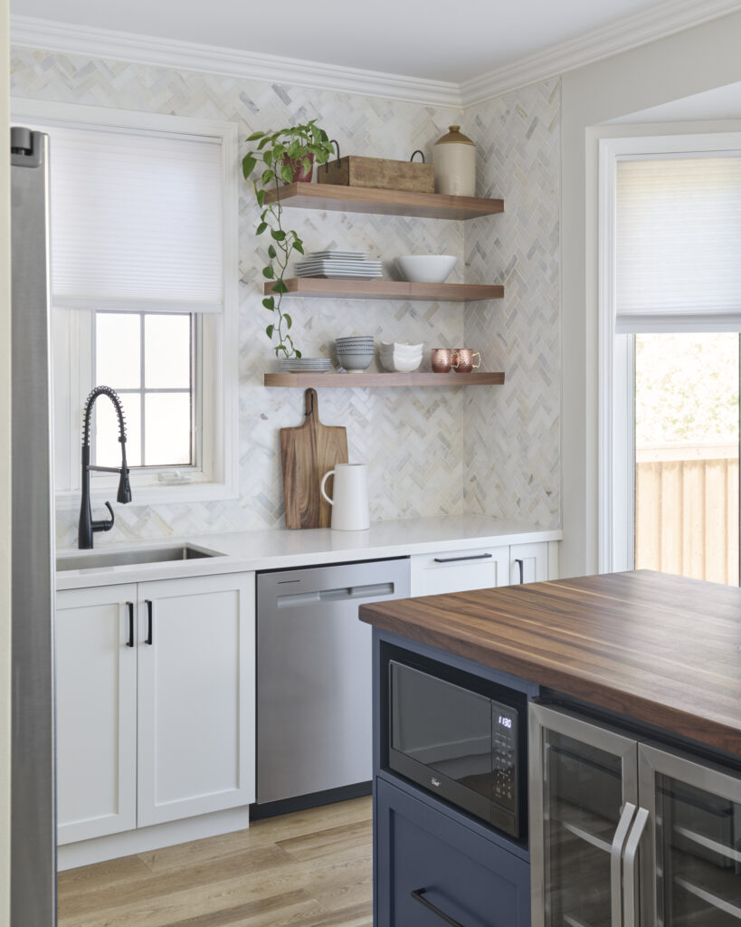 The space is further elevated by a striking herringbone tile backsplash, adding subtle texture and sophistication behind the sink and along the main wall. Above, natural wood open shelving offers a curated space to display dishware and décor, softening the design while maintaining a clean, airy look.