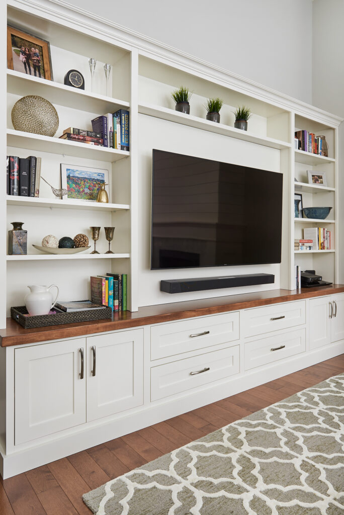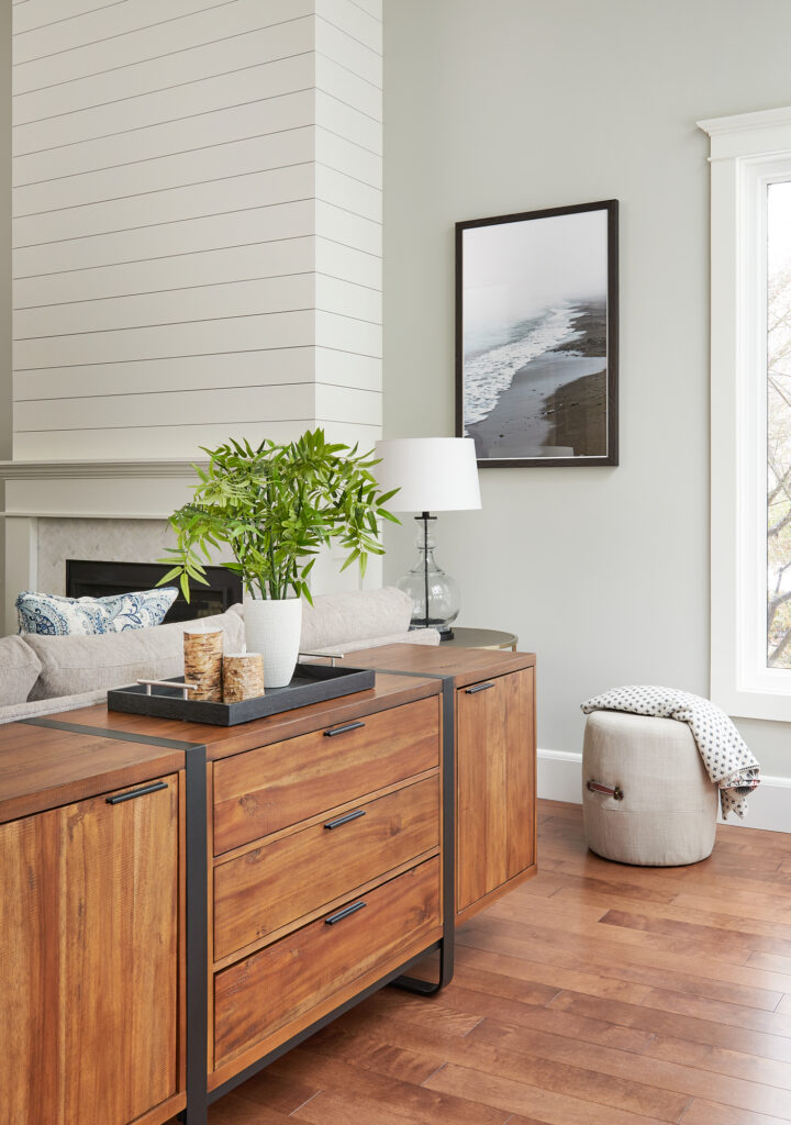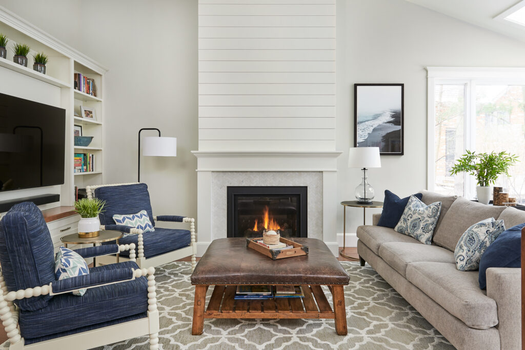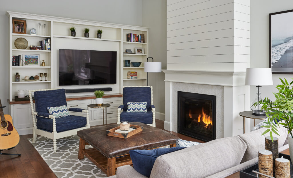 At the heart of the room is a newly added gas fireplace, clad in crisp white shiplap for a modern yet timeless focal point. On the adjacent wall, is a custom entertainment wall with built-in shelving and media storage, offering both function and personality through carefully styled open displays.