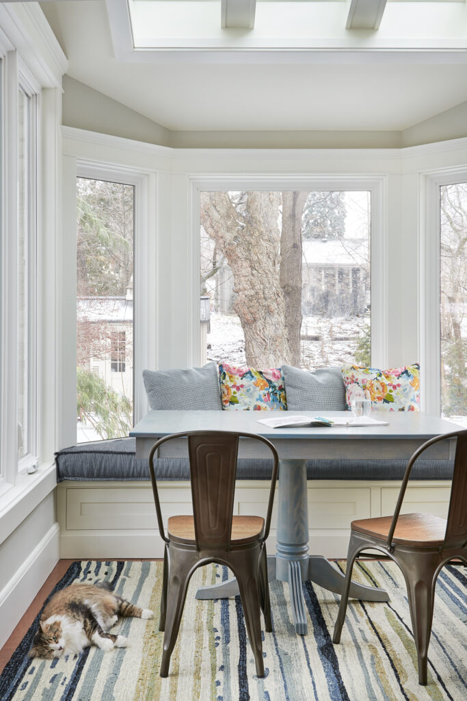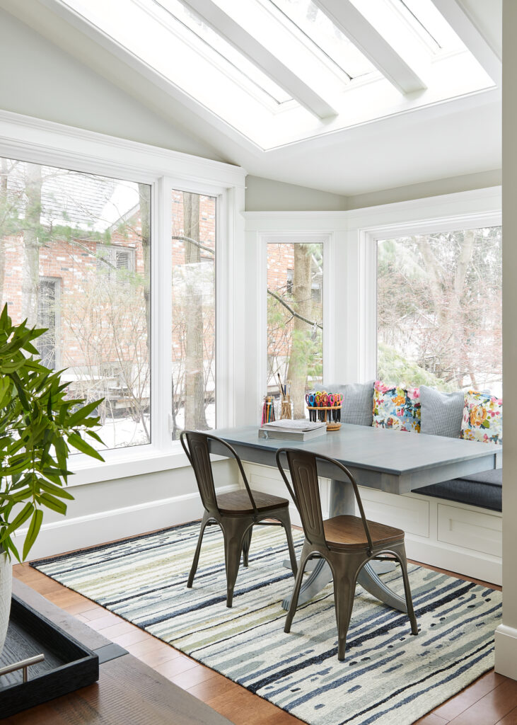New hardwood floors bring warmth and cohesion to the space, while thoughtfully chosen furniture—like the deep navy spindle chairs and tufted leather ottoman—creates a cozy yet polished gathering spot. A clever addition to the layout is a built-in bench and table area, designed with kids’ crafts and family activities in mind. It provides a practical, flexible zone that encourages creativity and casual dining, all within view of the main living area.
