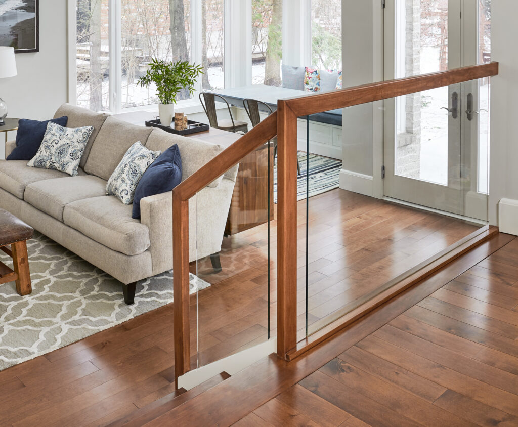 What was once a closed-off room housing a hot tub has been completely reimagined into a bright, multifunctional family-friendly living area that now flows seamlessly into the adjacent kitchen. By removing interior walls and installing a glass railing and new staircase, the space now feels open, connected, and full of natural light.