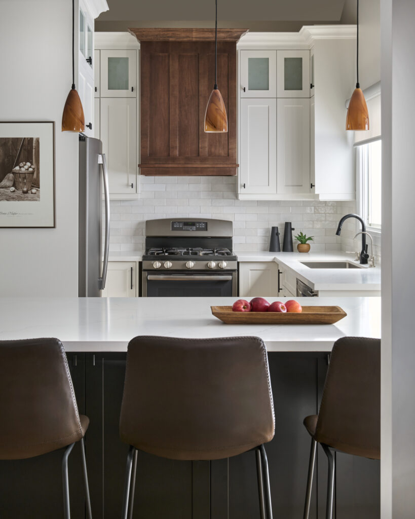 At the center of the kitchen stands a custom black island, a bold contrast to the surrounding white cabinetry. This island not only offers additional prep space and seating but also serves as a striking focal point. A tailored wood range hood adds warmth and craftsmanship above the cooking area, reinforcing the balance between modern lines and natural textures.
