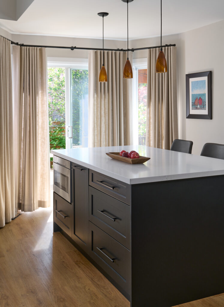 Silvan Modern is a sophisticated blend of warmth and contemporary design, reimagined to improve both function and flow. A key architectural change involved extending the kitchen wall, which helped define the space and allowed for a more cohesive layout. The addition of new wide-plank flooring throughout enhances the visual continuity and brings a rich, grounded tone to the home.