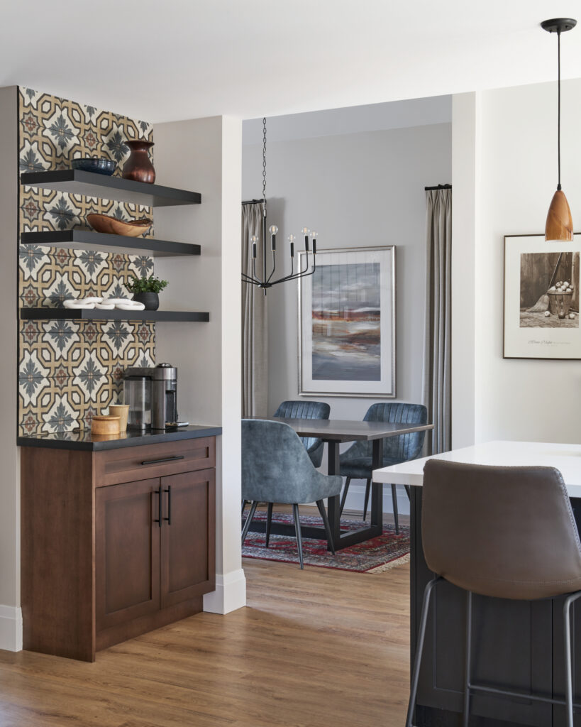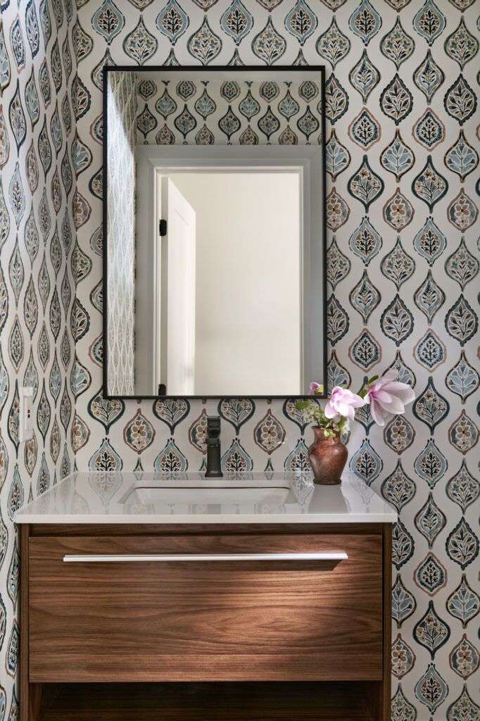 As a finishing touch, the adjacent powder room was updated with dramatic wallpaper, adding unexpected personality and style in a compact space. Together, these thoughtful updates bring a fresh, modern sensibility to the home while honoring its inviting, livable character.